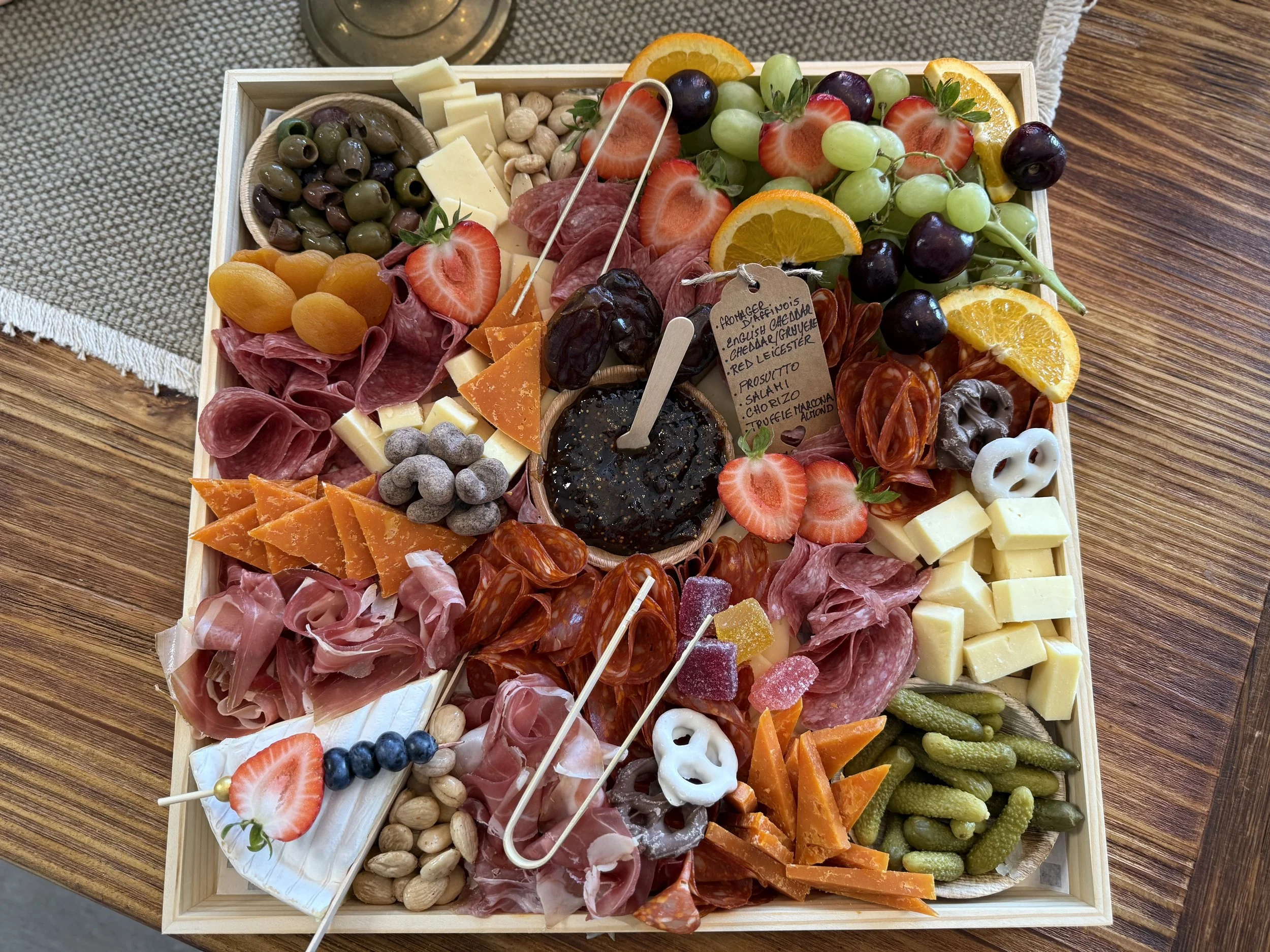 The Medium Charcuterie Board includes: 3 cheeses (1/2 Lb.) each & 3 Meats (total of 1Lb), Fruits, Pickels, Olives, Dried fruits, Nuts & Chocolate.